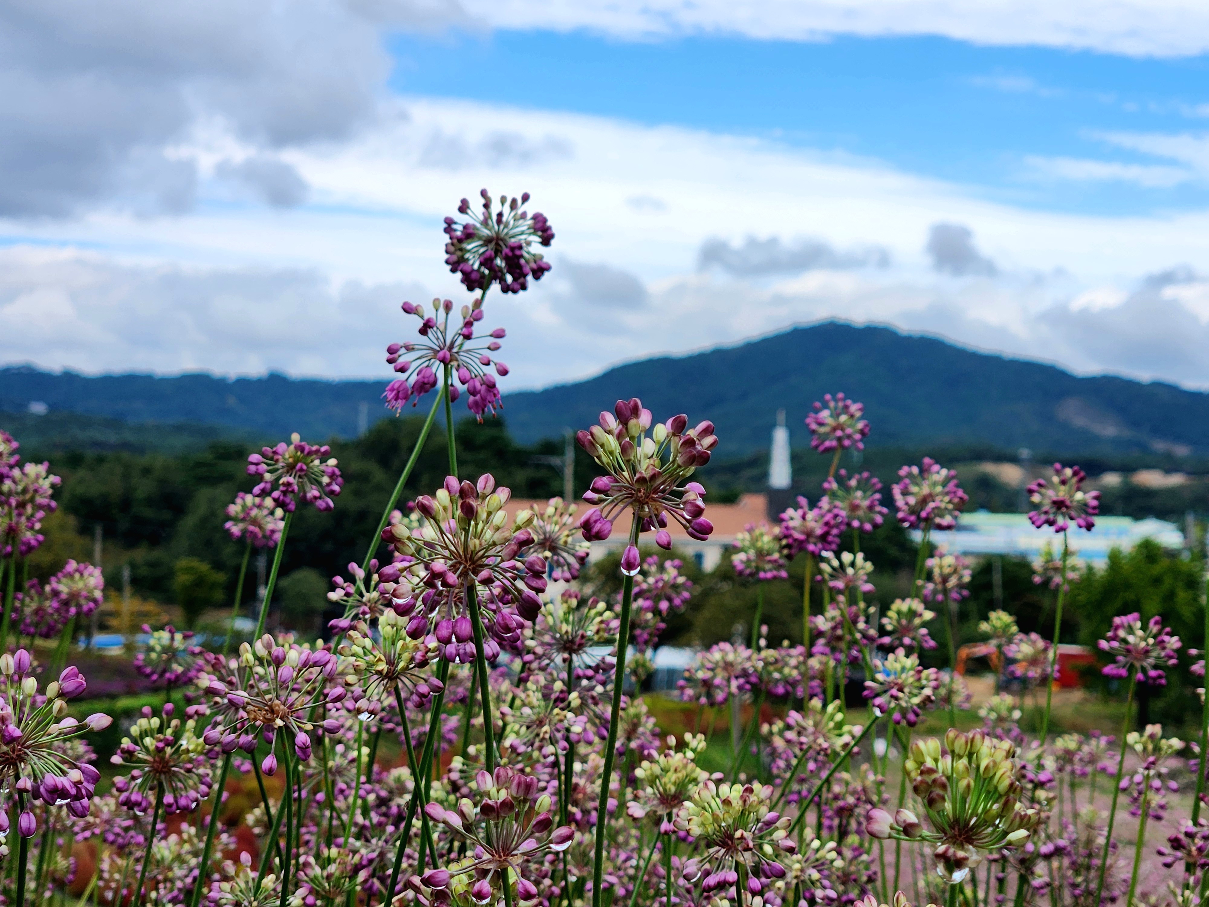 꽃은 경사를 이루고 있는 계단식 밭에 조화롭게
