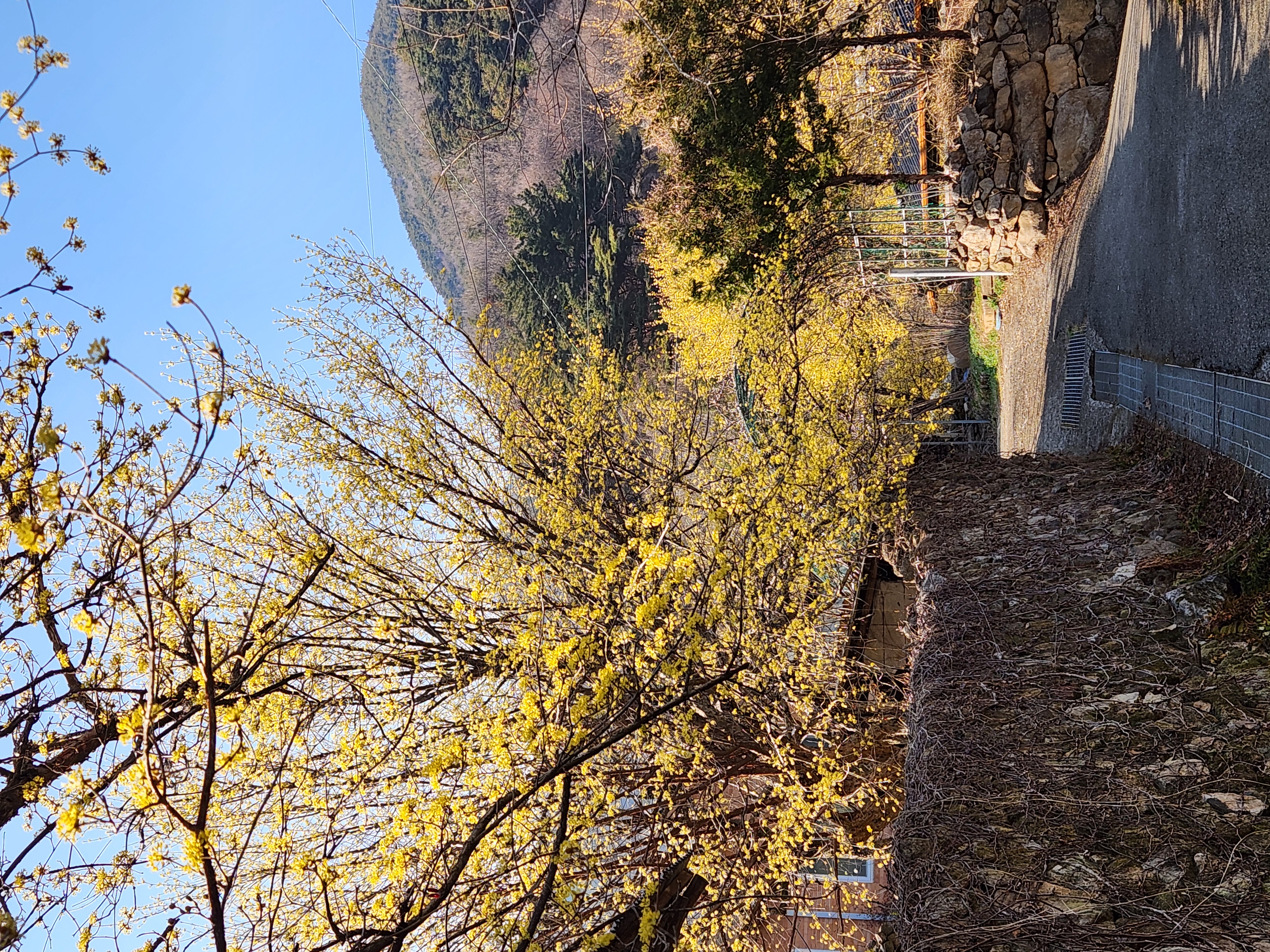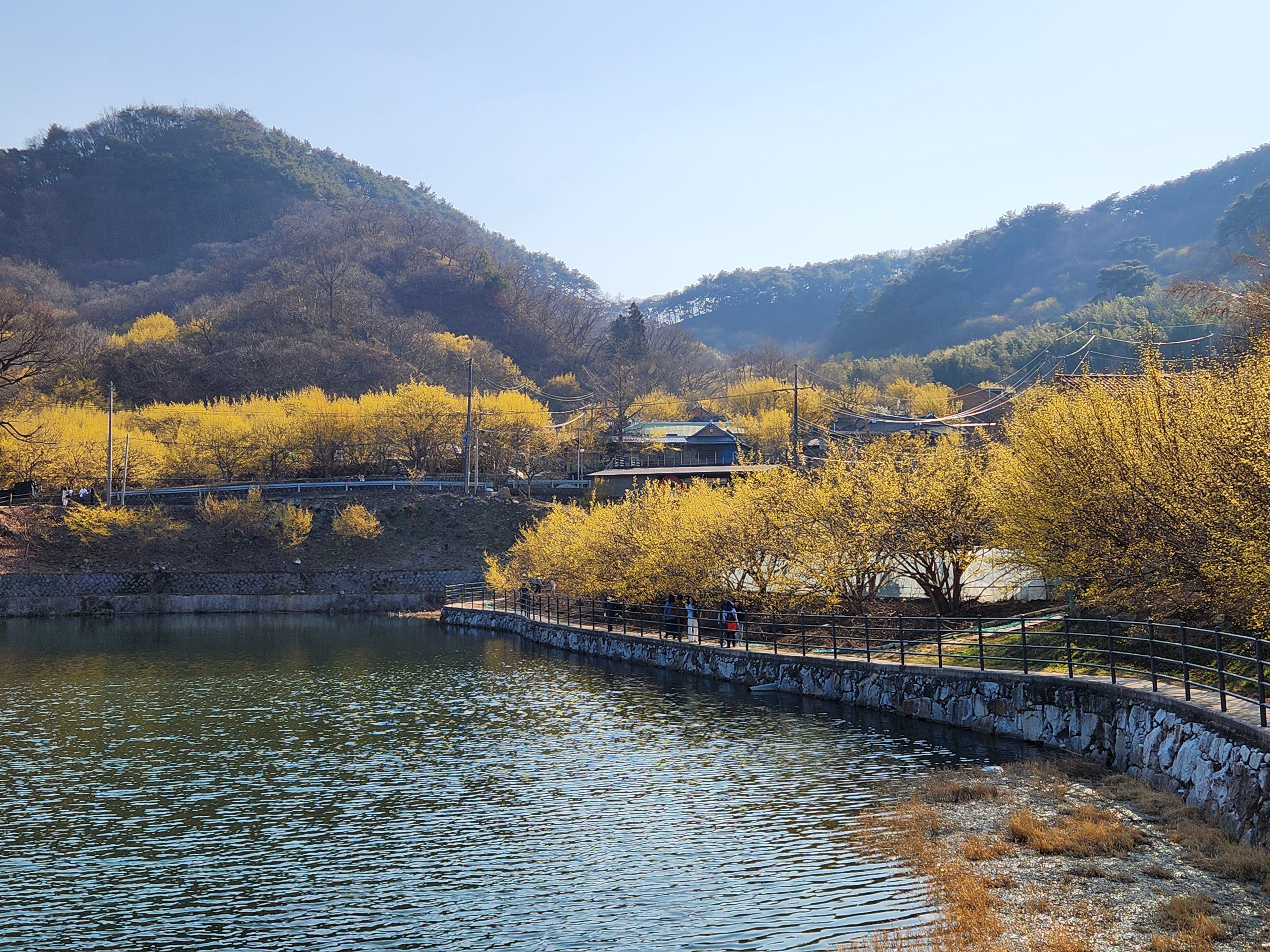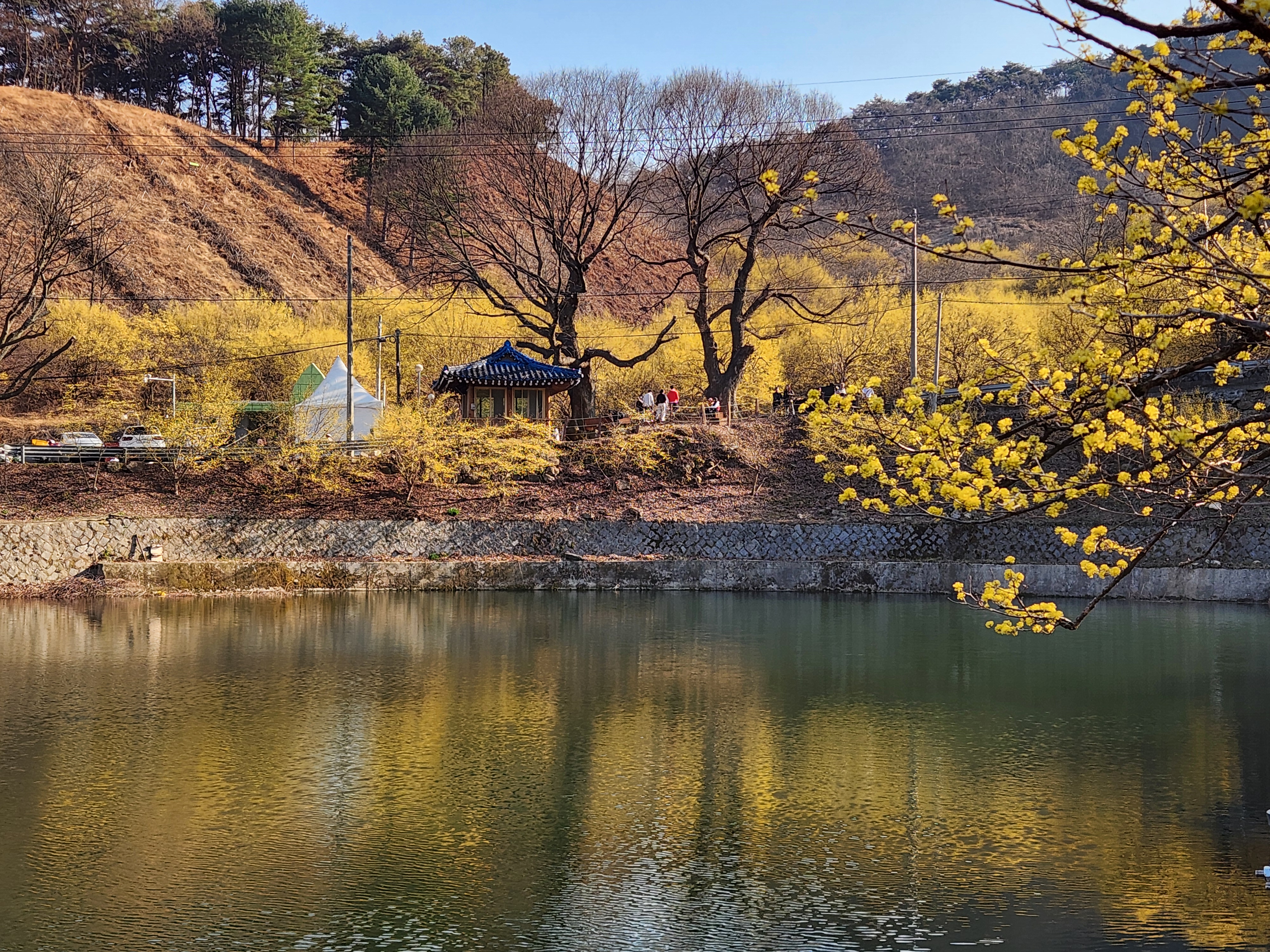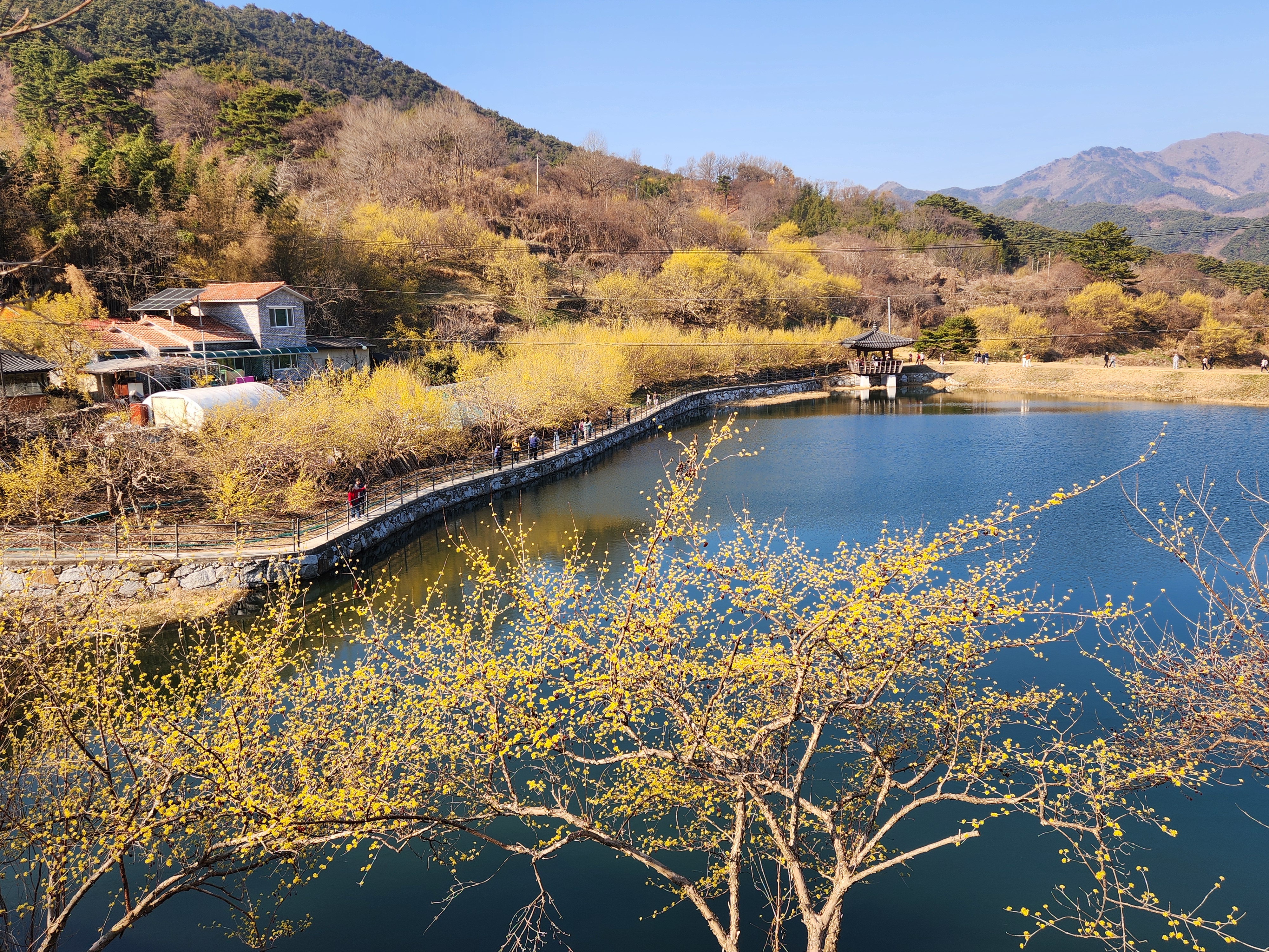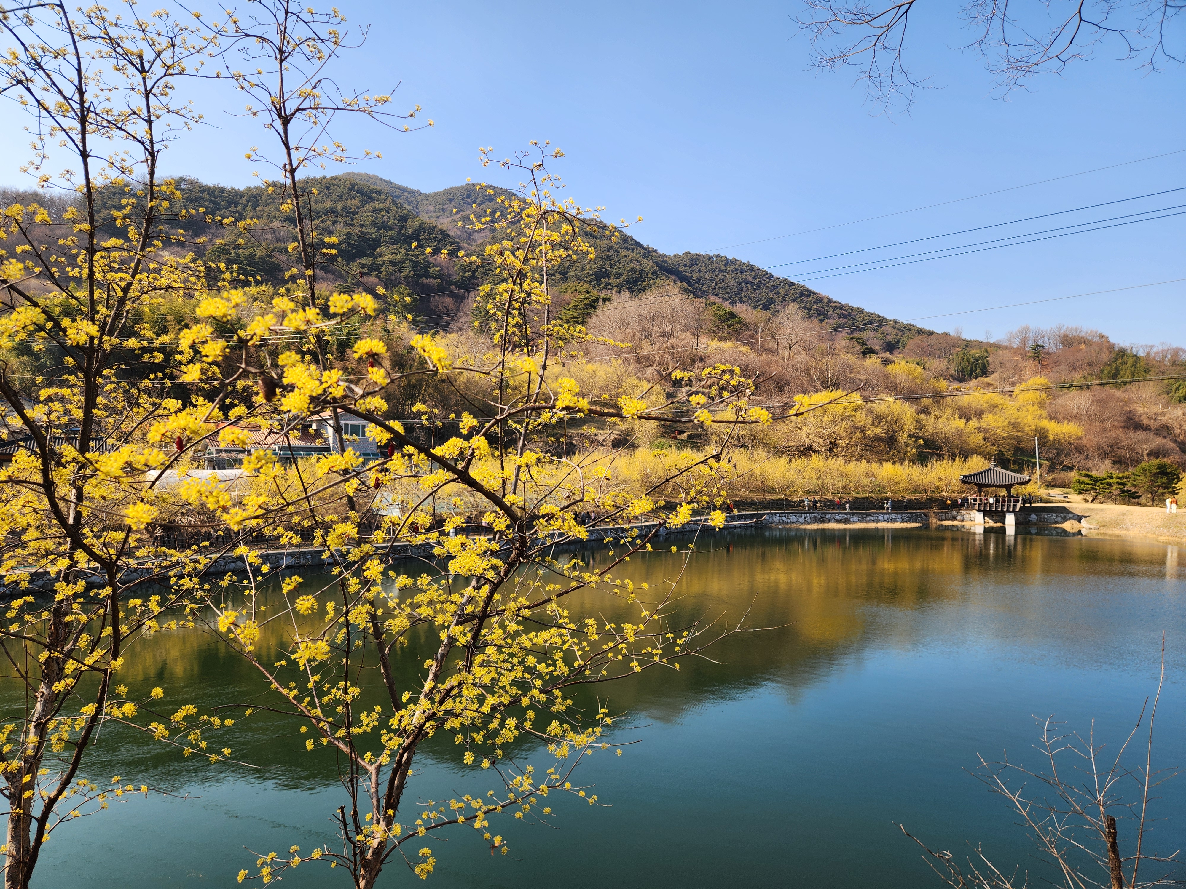 산수유꽃과 어우러진 현천제 둘레길 풍광